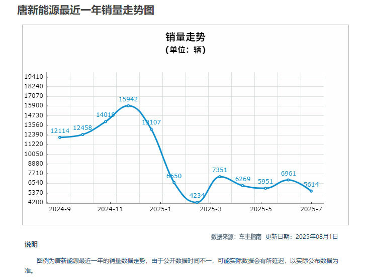 作为参考,比亚迪唐2025年七月销量为5614辆,今年累计销量为43030辆,整体成绩可圈可点。但从销量走势图可以看出,自从三月份出现峰值后,其市场表现一直在下降,从月销超过7千辆下滑至5千多辆的水平。