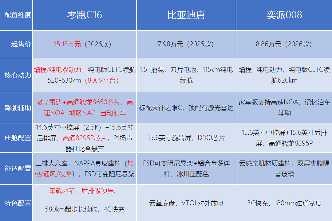 比亚迪唐DM-i提供中控大屏,但全系没有车载冰箱和后排娱乐屏。奕派eπ008标配后排娱乐屏和车载冰箱,但它的冰箱温控区间只能在5℃至50℃区间,不能达到0℃及以下,出游露营喝个冷饮料可以满足,但是冰棍雪糕则无法存放。三款车横向对比之下,显然2026款零跑C16在科技配置和舒适配置上表现更突出。