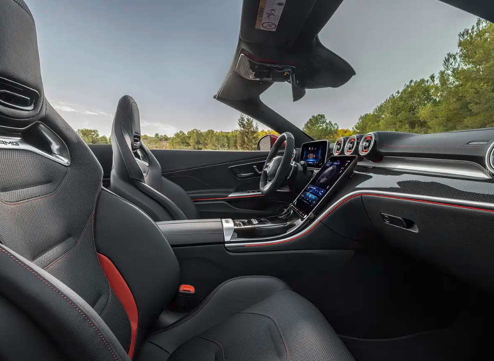 内饰方面,新车配备11.9英寸悬浮式液晶仪表,竖向中控屏的尺寸为12.3英寸,车内比普通版应用更多的碳纤维材质,细节处的红色缝线增强了运动气息。新车的AMG运动座椅拥有更强的侧翼支撑,头枕位置还有暖风系统,敞篷打开时能让驾驶员保持温暖。