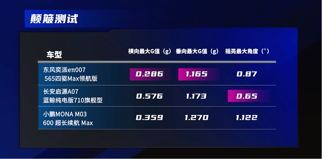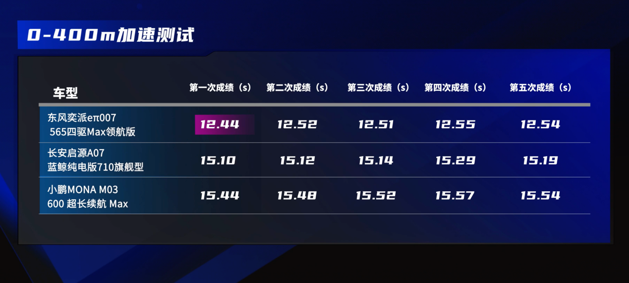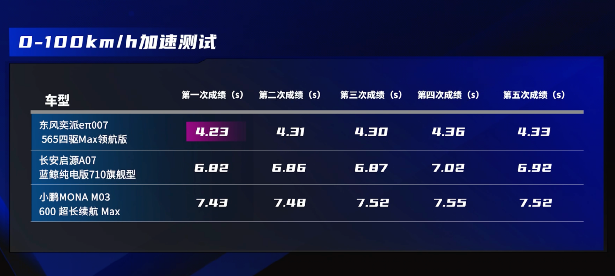 在三车性能测试中,东风奕派eπ007如尖子生,分别在0-100km/h加速测试,0-400m加速测试、麋鹿测试、颠簸测试中获得优异的成绩。