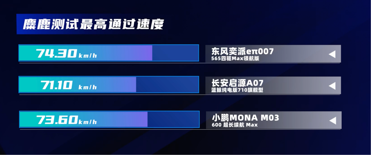 麋鹿测试当中,东风奕派eπ007凭借五连杆后悬架+四驱系统配合运动的调校取向,最终获得最高通过速度74.3km/h的麋鹿成绩,操控极限同级领先,在三者之中脱引而出。