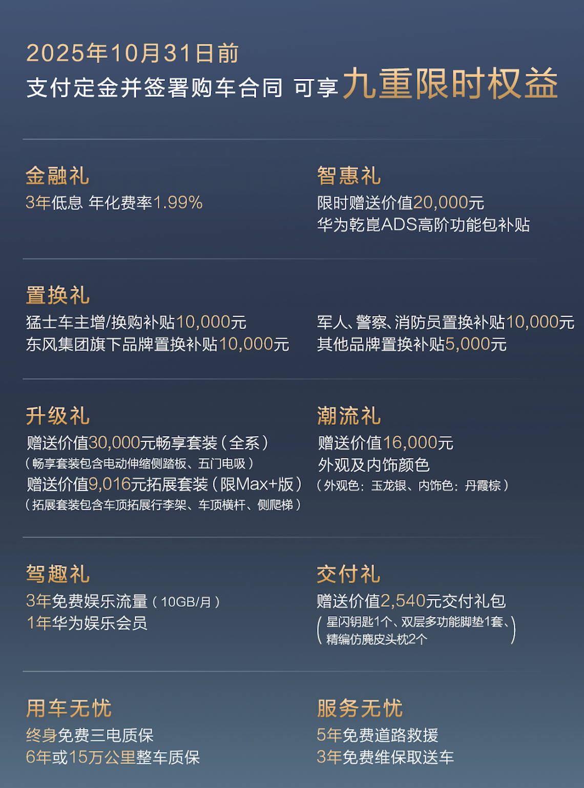 此外,猛士M817还可享受3年低息金融政策、20000元华为乾崑ADS 4高阶功能包选装抵扣权益、增换购补贴、终身免费三电质保、整车6年15万公里质保等权益。