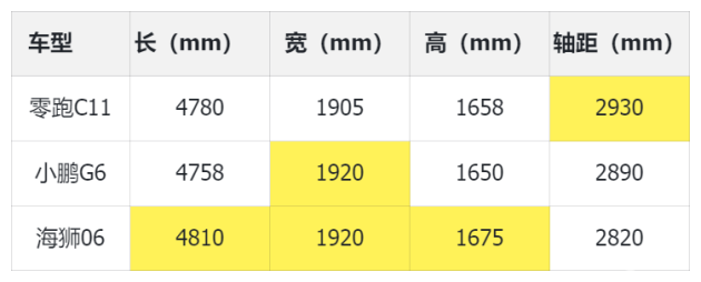 零跑C11、小鹏G6、海狮06EV均定位为中型SUV,尺寸差别并不是很大,空间舒适性方面均不错。只是零跑C11因为更长的轴距(2930mm),因此给用户提供了比小鹏G6(2890mm)、海狮06EV(2820mm)更宽松的后排乘坐舒适性。