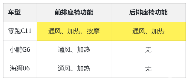 在座椅舒适性配置方面,零跑C11也是三款车中唯一提供后排座椅通风/加热功能的车型。要知道即便是指导价19.88万的顶配小鹏G6也只是给后排提供了座椅加热功能,比零跑C11顶配还略贵的入门级车型后排座椅更是只支持靠背调节。海狮06EV则全系没有该配置。