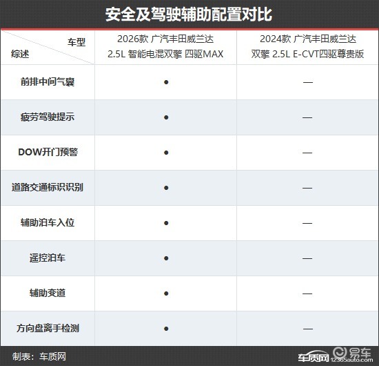 安全配置方面,新款威兰达在主/被动安全配置有所提升,较老款威兰达新增加了前排中间气囊、疲劳驾驶提示以及DOW开门预警,全方位强化了行车过程中的安全防护。