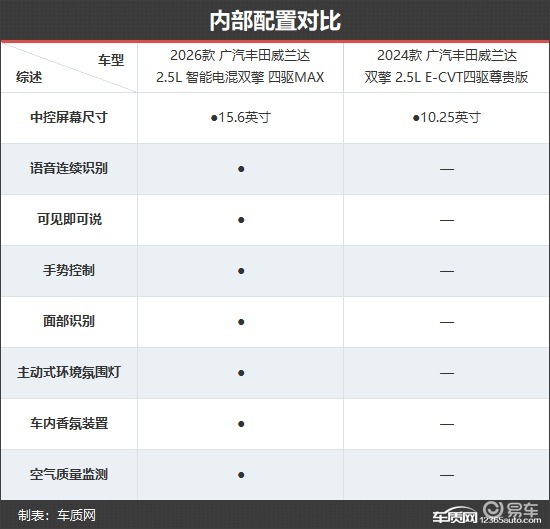 内部配置方面,新款威兰达新增语音连续识别、可见即可说、手势控制、面部识别等功能,交互更便捷智能;同时还加入了主动式环境氛围灯、车内香氛装置、空气质量监测等,提升用车体验。