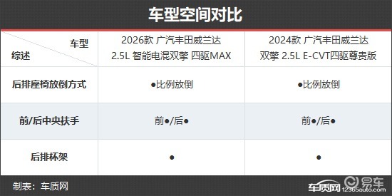 全新威兰达是广汽丰田智能化转型的首款燃油车,此次共推出9款车型,官方指导价16.98-23.08万元。相比老款威兰达而言,车型数量有所精简,入门和顶配车型价格均有所下调,动力上则增加了2.0L混动系统。本次对比选择了新老款顶配车型,以便能够更加直观地看出在配置层面的具体差异。