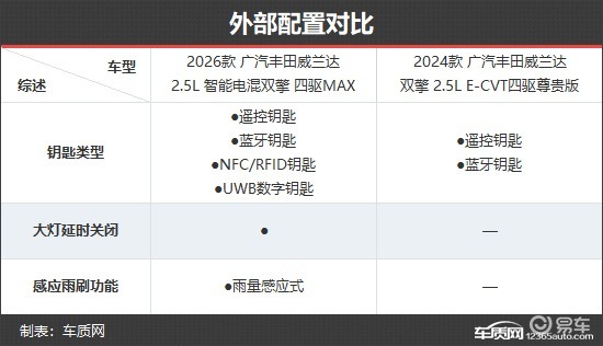 外部配置方面,新款威兰达不仅增加了NFC/RFID钥匙和UWB数字钥匙,提升日常便利性,而且还提供大灯延时关闭和雨量感应式雨刷功能,用车体验更出色。