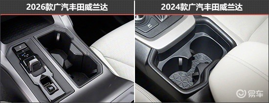 由于新款威兰达换装了更为小巧的电子换挡杆,中控台布局得以优化。中控屏下方采用了双层储物槽布局,相比老款单一的储物格,能更灵活地分类放置手机、卡片等小物件,实用性明显提升;同时,少了传统挡把的遮挡,拿取前方储物槽内的物品时更加方便。