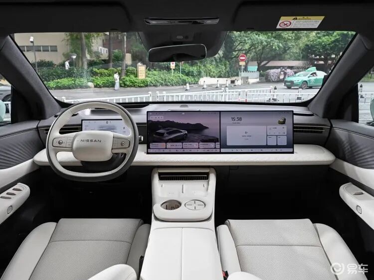 内饰没有使用此前N系列那种家族化造型,而是换装了全新的设计。最惹眼的就是中央屏和副驾屏组成的双15.6英寸连屏设计,配合10.25英寸仪表盘、63英寸AR HUD抬头显示,展现出不错的科技感。车机使用了8295P芯片,内置NISSAN OS 2.0,支持四音区智能语音等功能。