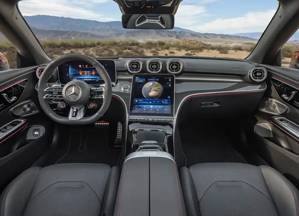 内饰方面,新车配备11.9英寸悬浮式液晶仪表,竖向中控屏的尺寸为12.3英寸,车内比普通版应用更多的碳纤维材质,细节处的红色缝线增强了运动气息。新车的AMG运动座椅拥有更强的侧翼支撑,头枕位置还有暖风系统,敞篷打开时能让驾驶员保持温暖。
