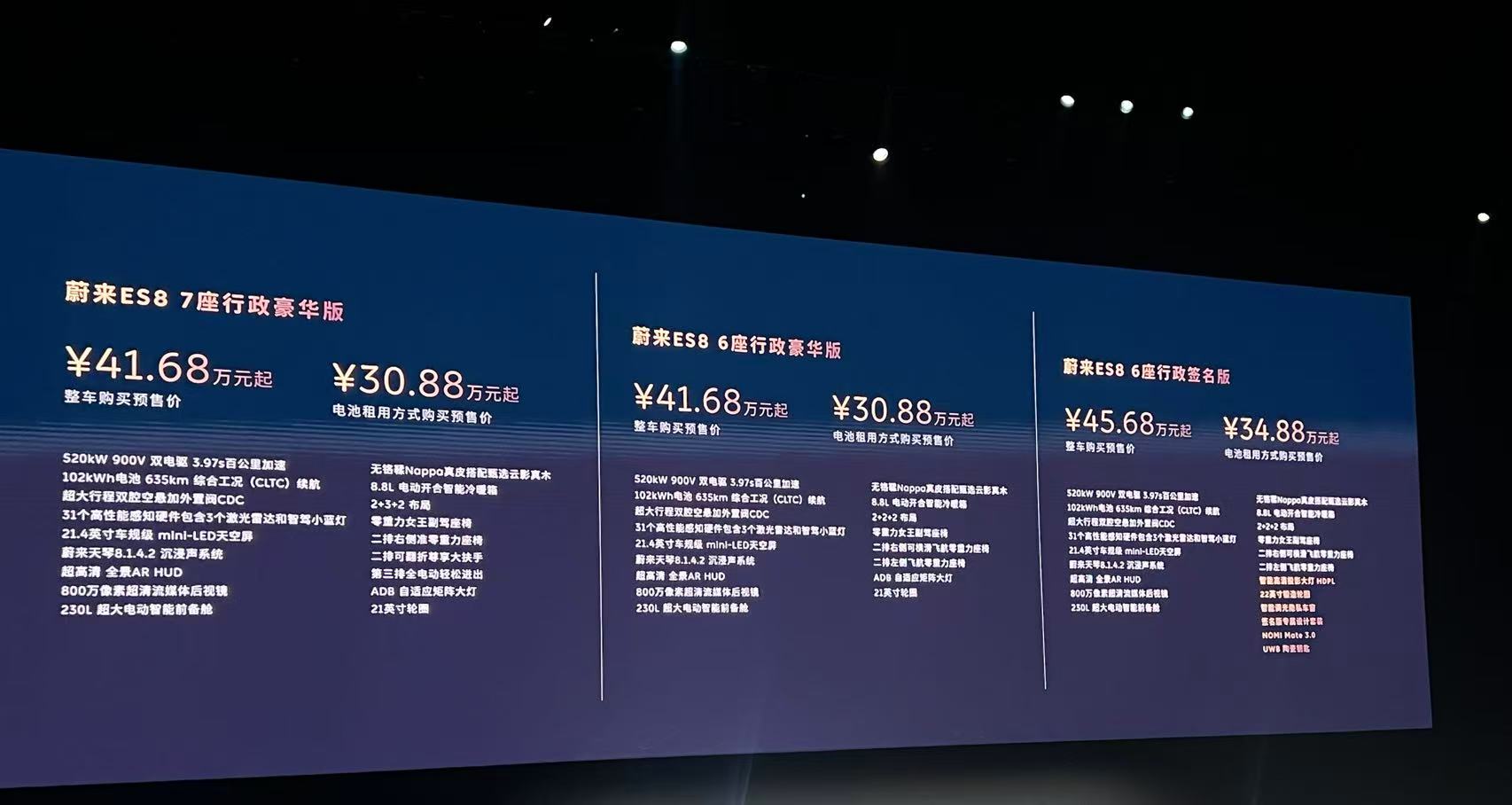 8月21日,全场景科技旗舰SUV——蔚来全新 ES8 正式发布并开启预售,行政豪华版六座/七座预售价 416,800 元起,采用 BaaS 电池租用方式购买,预售价 308,800 元起;行政签名版预售价 456,800 元起,采用 BaaS 电池租用方式购买,预售价 348,800 元起。全新 ES8 将于 9 月下旬正式上市并开启交付。