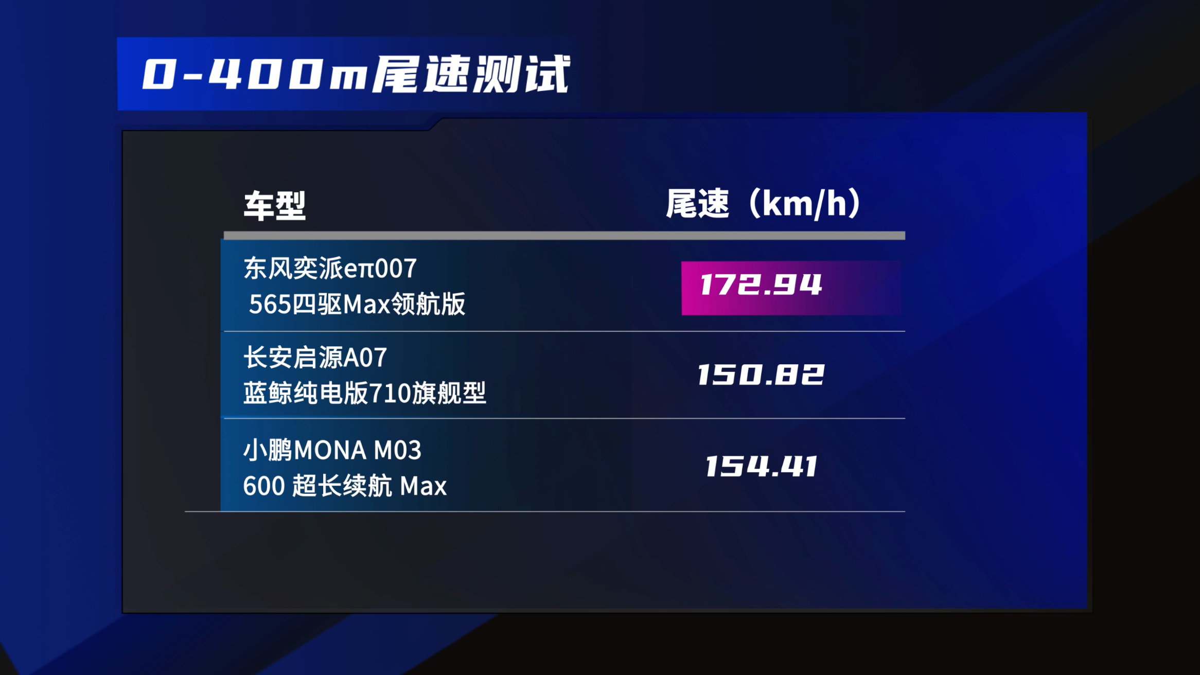 而在0-400m加速测试中,东风奕派eπ007加速稳定强劲,后劲十足,最终成绩12.44s,尾速172.94km/h,碾压另外两台车的同时,我愿称之为 “3.0T高功率水准”。