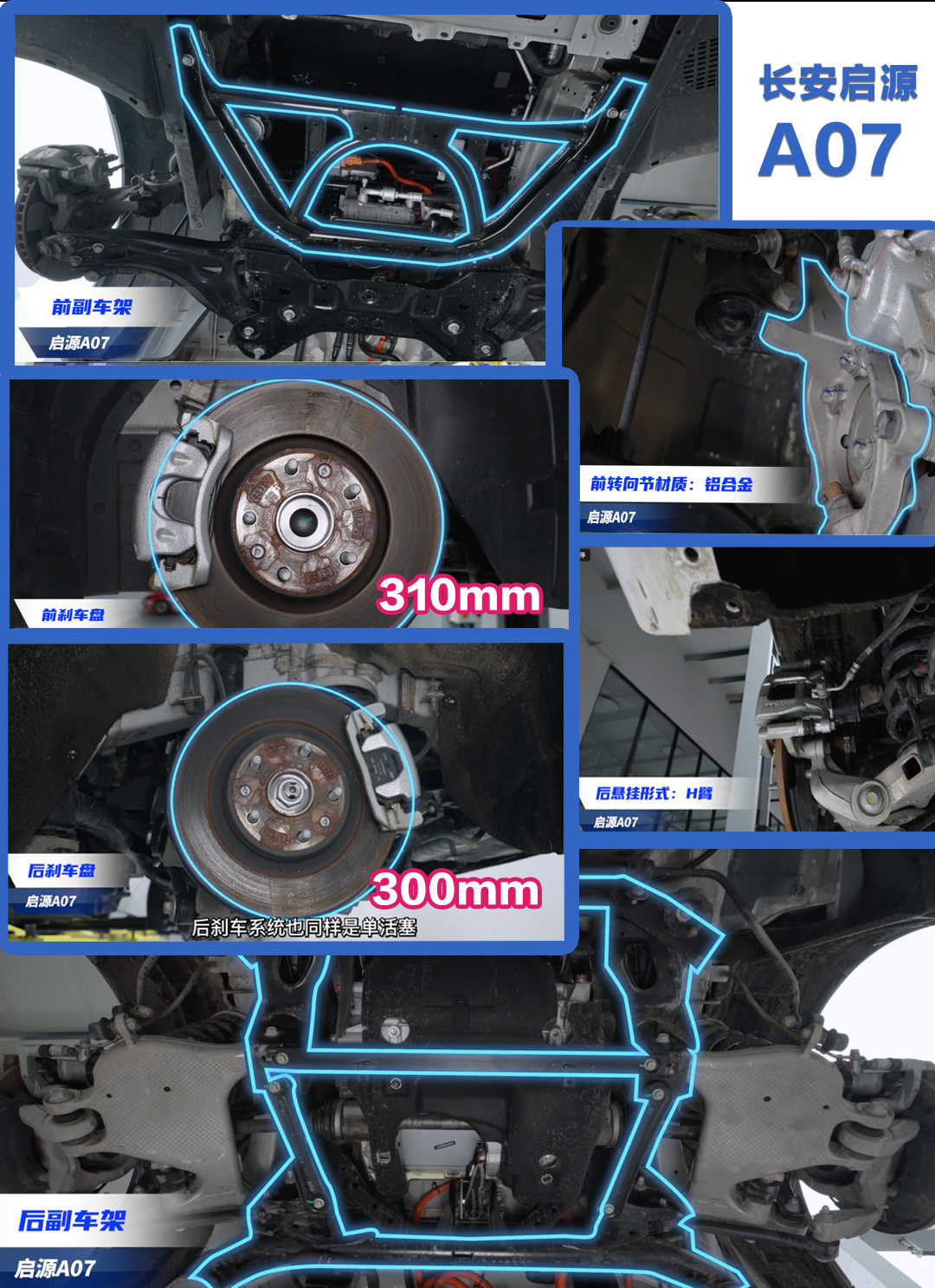长安启源A07同样是全框式前副车架,悬架部分三者居中,比小鹏MONA M03更好些的是后悬架采用H臂结构,相对比扭力梁悬架会更舒适些。