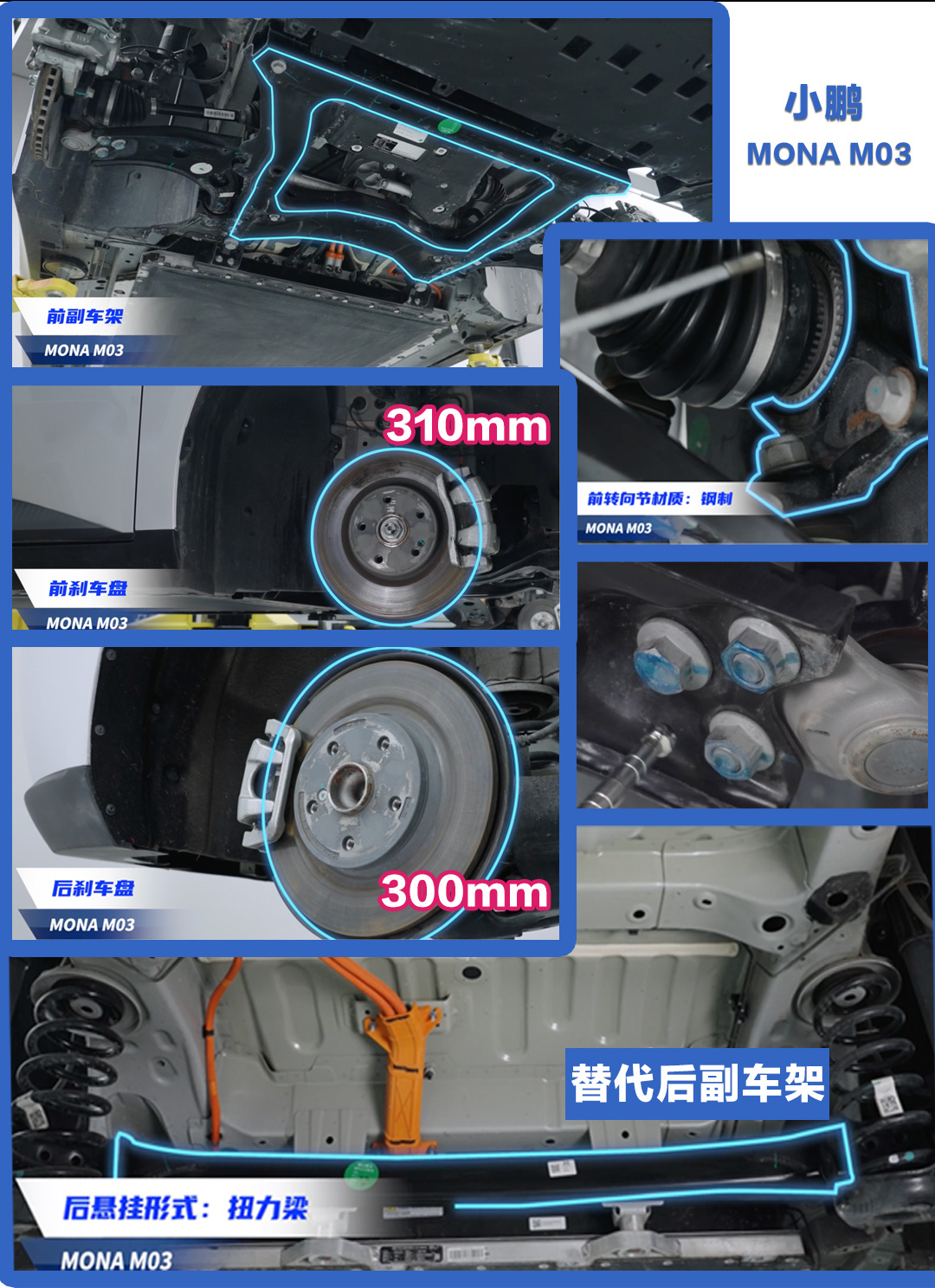 其中小鹏MONA M03悬架方面是全框式前副车架,悬架方面是三辆车中相对“落后”的,前麦弗逊式独立悬挂,后扭力梁悬挂显短板;
