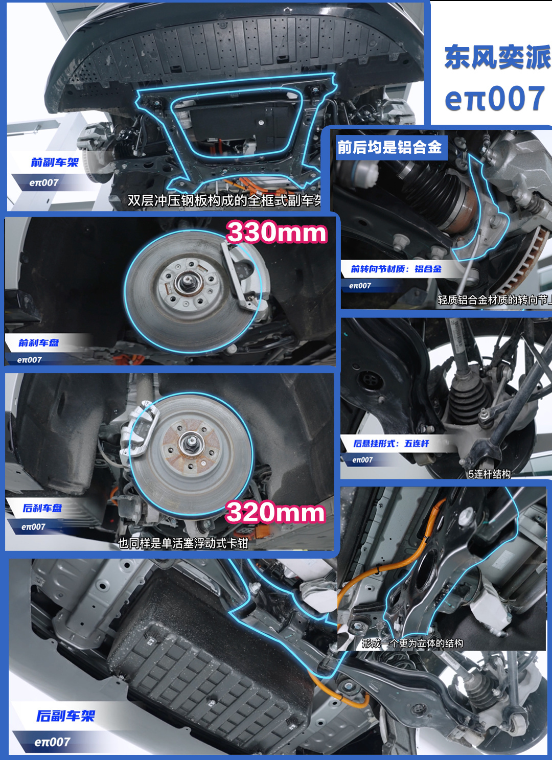 而东风奕派eπ007搭载五连杆后悬,悬架操控与舒适双在线的背后是硬件成本的投入,可以看到它前副车架为双层冲压钢板构成的全框式结构,后副车架为全框式结构,布置更立体,与车身通过四个软性连接点相连,强度大,行驶中车身一体性更佳,乘坐更舒适。
