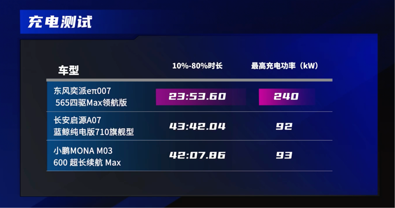 从快充测试当中可以看到,东风奕派eπ007 补能适配性更强,在华为充电桩实测10-80%SOC充电时间不到24分钟,最高充电功率达240kW,是其他两台车的两倍有余;