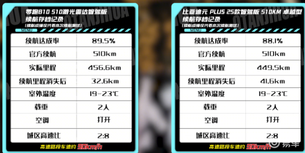 目前,零跑B10在紧凑级纯电动SUV市场表现非常抢眼,即使在8月份这样的销售淡季,仍售出6926辆,6月份更高达14312辆。零跑B10的热销自然引起了很多关注,许多第三方媒体对其进行了测试和评估。例如,有媒体对零跑B10和比亚迪元PLUS进行了续航对比测试。零跑B10 510激光雷达版标称续航510公里,实际测试中行驶了456公里,续航达成率为89.5%。测试条件为室外温度19-23摄氏度,两人乘坐,空调开启,城区高速比2:8,高速平均速度90公里/小时。相比之下,搭载刀片电池的比亚迪元PLUS续航达成率为88.1%。