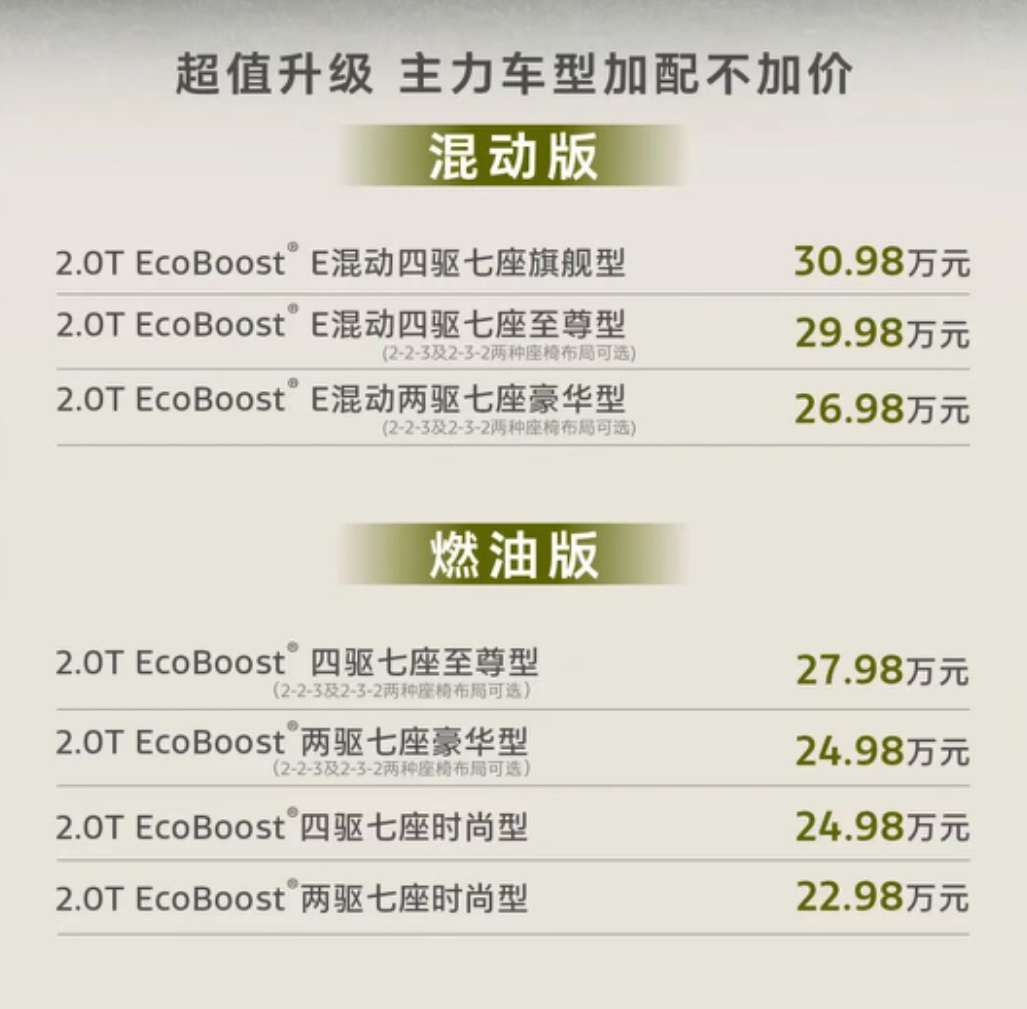 9月26日,2026款福特锐界L同样改款上市,但没想到它的变化比汉兰达更大。官方定价22.98万至30.98万,配置方面提升显著,而且是雨露均沾,每一个版本都有不小的升级,对比同价位汉兰达,我们来看看谁更胜一筹。