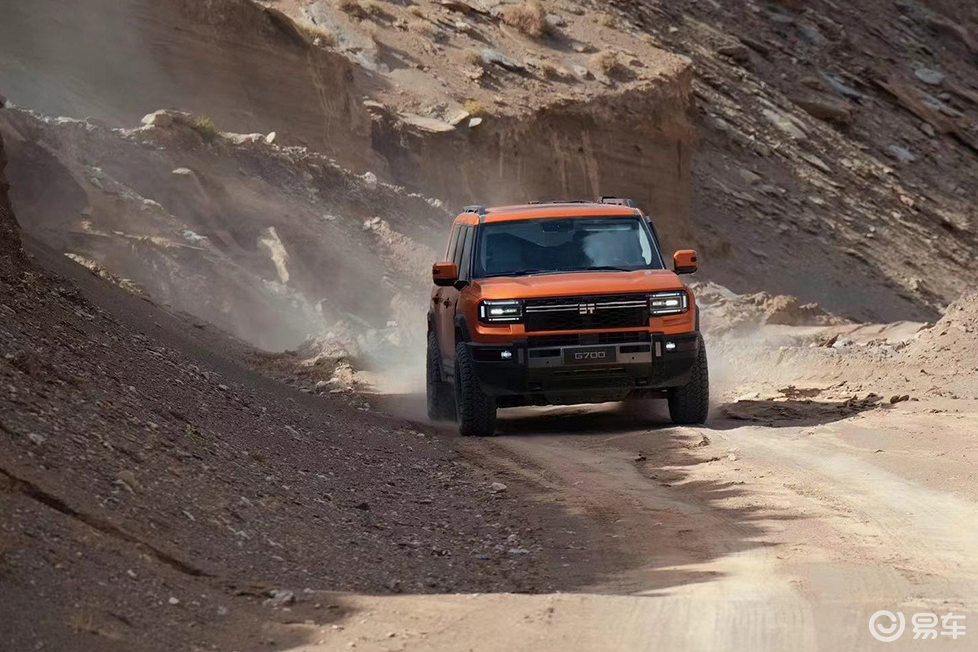 从设计来看,G700是一台很有气势的“方盒子越野SUV”。孔武有力的硬派线条,几乎无需过多修饰就能显露出它的肌肉与野性张力。与此同时,它有着非常大的尺寸,其长宽高三围分别可达5198/2050/1956mm,即便是把它放在路虎卫士D110身旁,G700也丝毫不会胆怯。