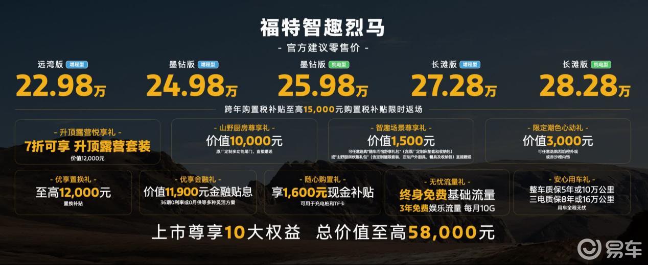 值得一提的是,福特智趣烈马还给出了5年或10万公里整车质保、8年或16万公里三电质保的承诺,再加上全国超过300家经销商的服务网络,让每一次出行都有坚实保障。从城市通勤的舒适便捷,到户外露营的趣味实用,再到轻度越野的硬核实力,这款车真正做到了“比越野新能源更城市,比城市新能源更越野”。