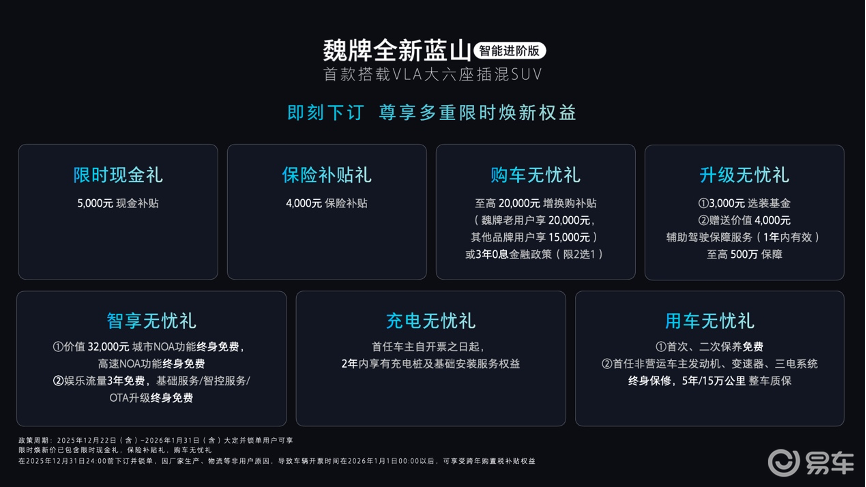 最后是价格,全新蓝山智能进阶版27.58万元的起售价已经包含了多项限时权益,如5000元现金补贴、4000元保险补贴,还有高额置换补贴、金融免息政策等。更值得关注的是,它提供了城市与高速NOA智驾功能终身免费、三电系统终身保修等长期福利,让用户买得放心,用得无忧。
