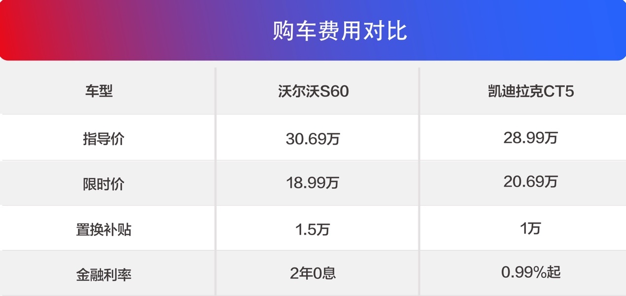 今天咱们选择的是沃尔沃S60 2026款 B4智逸豪华版 指导价30.69万和凯迪拉克CT5 28T 城市风尚版 指导价28.99万。单看指导价,S60比CT5贵了1.7万元。但是现在S60限时参考尊享价18.99万,还有至高15000元购置补贴以及0首付起2年0息的政策。而凯迪拉克CT5限时一口价20.69万,置换补贴10000元,金融方案利息0.99%起。两车在指导价上的1.7万元差价被抹平了,置换补贴和金融方案的利息方面,CT5要比S60多花好几千块,增加了购车成本。